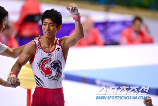 21일 오후 인천 남동체육관에서 2014 인천 아시안게임 체조 남자 개인 예선 및 단체 결승전이 열렸다. 링 연기를 마친 한국 양학선이 손을 번쩍 들어올리고 있다.