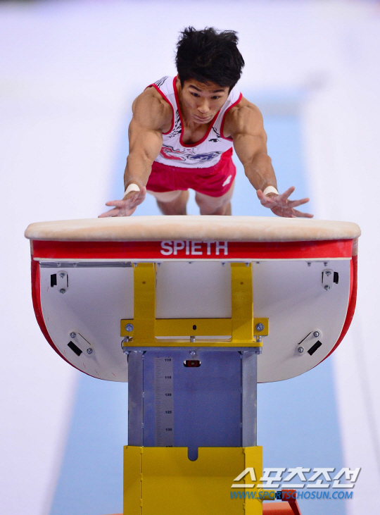 21일 오후 인천 남동체육관에서 2014 인천 아시안게임 체조 남자 개인 예선 및 단체 결승전이 열렸다. 한국 양학선이 도마 연기를 하고 있다.