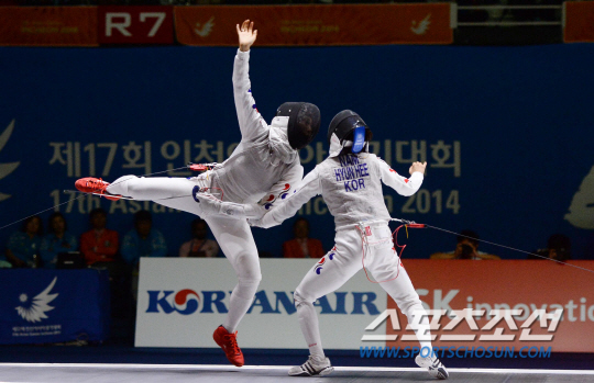 한국여자펜싱 플뢰레 남현희(성남시청) 와 전희숙(서울시청)이 21일 고양체육관에서 열린 2014 인천아시안게임 준결승에서 맞붙었다.