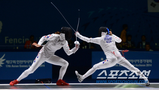 한국여자펜싱 플뢰레 남현희(성남시청) 와 전희숙(서울시청)이 21일 고양체육관에서 열린 2014 인천아시안게임 준결승에서 맞붙었다.