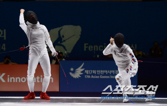 한국여자펜싱 플뢰레 남현희(성남시청) 와 전희숙(서울시청)이 21일 고양체육관에서 열린 2014 인천아시안게임 준결승에서 맞붙었다.