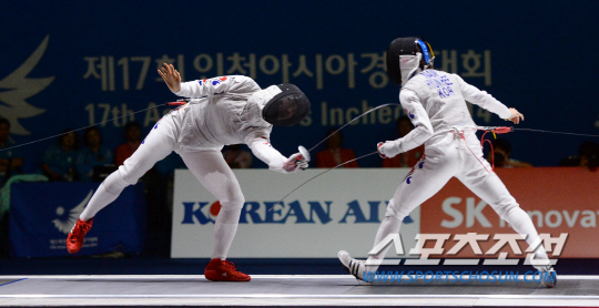 한국여자펜싱 플뢰레 남현희(성남시청) 와 전희숙(서울시청)이 21일 고양체육관에서 열린 2014 인천아시안게임 준결승에서 맞붙었다. 남현희와 전희숙이 서로 찌르기 공격을 시도하고 있다.