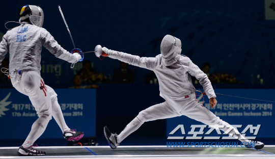 한국남자펜싱 김정환이 21일 고양체육관에서 열린 2014 인천 아시안게임 남자 펜싱 사브르 준결승전에서 람힌충(홍콩)에게 찌르기 공격을 시도하고 있다. 15대9로 승리한 김정환은 결승에 진출했다