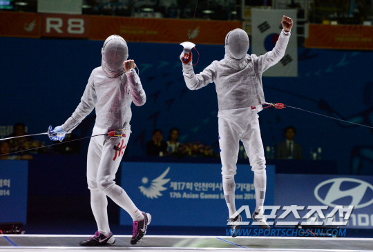한국남자펜싱 김정환이 21일 고양체육관에서 열린 2014 인천 아시안게임 남자 펜싱 사브르 준결승전에서 람힌충(홍콩)에게 베기공격을 시도하고 있다. 15대9로 승리한 김정환은 결승에 진출했다