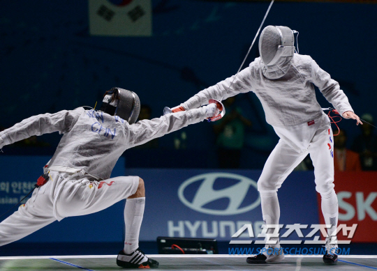 한국남자펜싱 구본길이 21일 고양체육관에서 열린 2014 인천 아시안게임 남자 펜싱 사브르 준결승전에서 쑨웨이(중국)에게 찌르기 공격을 시도하고 있다. 15대10으로 승리한 구본길은 한국의 김정환과 금메달을 두고 결승에서 겨룬다