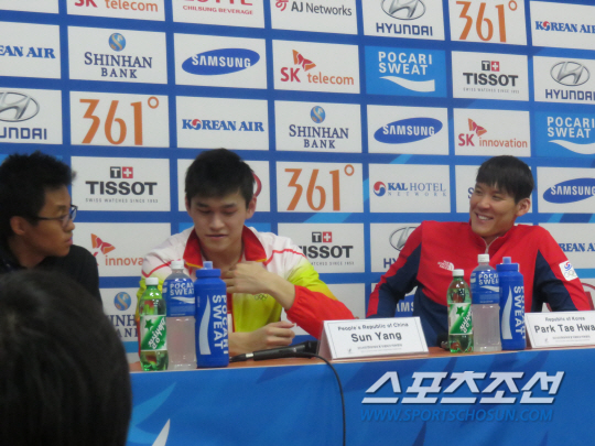 쑨양이 자유형 200m 레이스 직후 기자회견에서 일찍 자리를 떴다. 21일 오후 박태환문학수영장에서 펼쳐진 인천아시안게임 첫경기 남자자유형 200m에서 박태환은 1분45초85의 기록으로 3위에 올랐다. 하기노 고스케가 1위, 쑨양이 2위를 기록했다. .