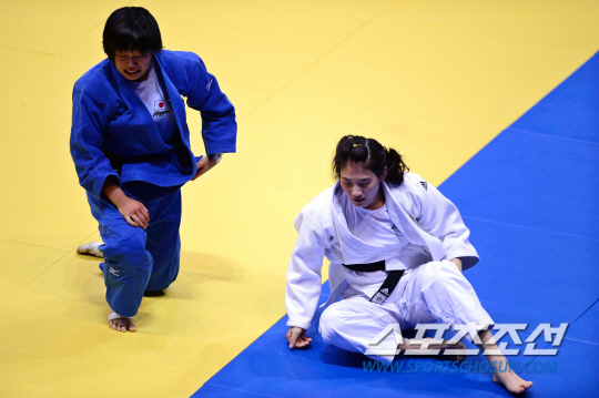 21일 오후 인천 송림체육관에서 2014 인천 아시안게임 유도 여자 -57kg 결승전이 열렸다. 일본 야마모토에게 패배한 한국 김잔디가 아쉬워하고 있다.