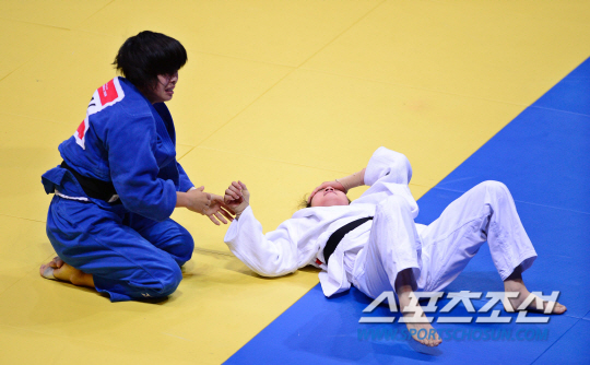 21일 오후 인천 송림체육관에서 2014 인천 아시안게임 유도 여자 -57kg 결승전이 열렸다. 일본 야마모토에게 패배한 한국 김잔디가 아쉬워하고 있다.