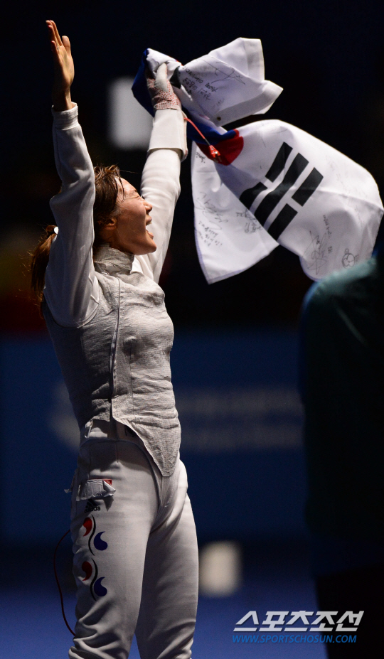 [AG포토] 중국 꺾고 만세 부르는 펜싱 전희숙