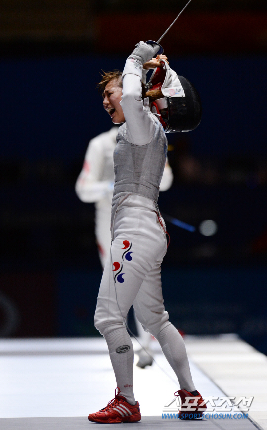 한국여자펜싱 플뢰레 전희숙(서울시청)이 21일 고양체육관에서 열린 2014 인천아시안게임 결승전에서 중국의 리 후아린을 꺾고 금메달을 차지하고 있다.