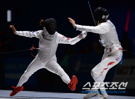 한국여자펜싱 플뢰레 전희숙(서울시청)이 21일 고양체육관에서 열린 2014 인천아시안게임 결승전에서 중국의 리 후아린을 상대로 찌르기를 성공시키고 있다.