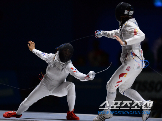 한국여자펜싱 플뢰레 전희숙(서울시청)이 21일 고양체육관에서 열린 2014 인천아시안게임 결승전에서 중국의 리 후아린을 상대로 찌르기를 성공시키고 있다.