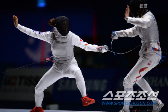 한국여자펜싱 플뢰레 전희숙(서울시청)이 21일 고양체육관에서 열린 2014 인천아시안게임 결승전에서 중국의 리 후아린을 상대로 찌르기를 성공시키고 있다.