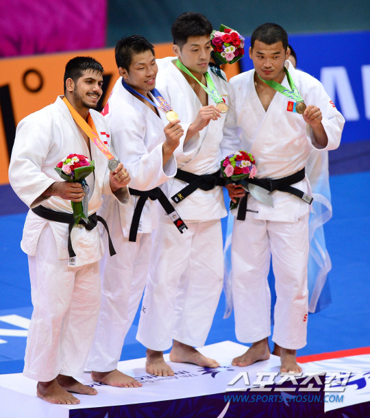 21일 오후 인천 송림체육관에서 2014 인천 아시안게임 유도 남자 -81kg 결승전이 열렸다. 시상식에서 한국 김재범이 금메달을 든채 포즈를 취하고 있다.