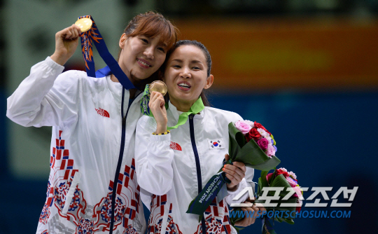 한국여자펜싱 플뢰레 전희숙(서울시청)과 남현희(성남시청)가 21일 고양체육관에서 열린 2014 인천아시안게임 시상식에서 나란히 금메달과 동메달을 차지한후 포즈를 취하고 있다.