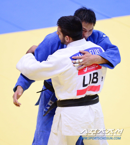 21일 오후 인천 송림체육관에서 2014 인천 아시안게임 유도 남자 -81kg 결승전이 열렸다. 금메달을 차지한 한국 김재범이 레바논 엘리아스와 포옹을 나누고 있다.