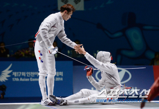 한국남자펜싱 구본길 21일 고양체육관에서 열린 2014 인천아시안게임 남자 펜싱 사브르 결승전에서 주저앉은 김정환을 일으켜 주고있다.