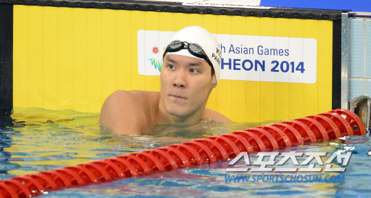2014 인천아시안게임에 출전한 '마린보이' 박태환이 21일 인천 문학박태환수영장에서 열린 남자 자유형 200m 예선경기에서 골인 후 기록을 살펴보고 있다. 박태환은 200m 예선에서 전체 4위로 결선에 진출했다.