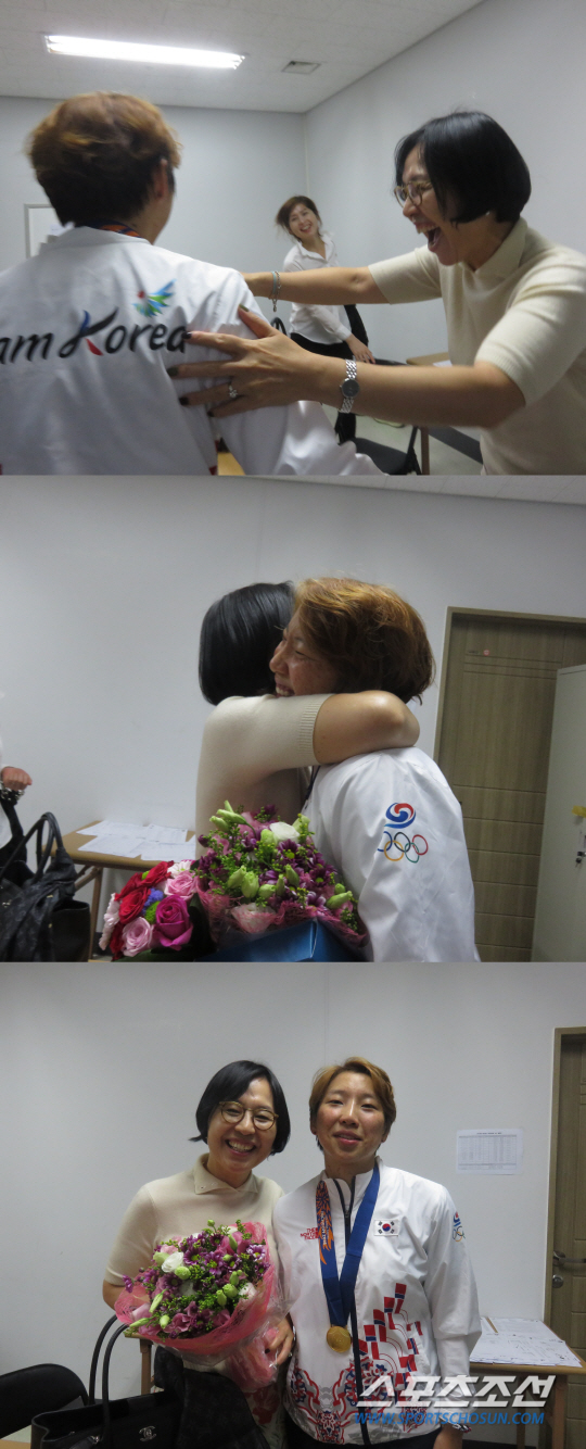 경기 직후 도핑테스트를 하러가는 이라진을 자원봉사요원이 급히 불러세웠다. "어머니가 오셨어요." 이라진의 눈이 휘둥그레졌다. "엄마? 우리 엄마요?" 이라진의 소속팀 장기철 인천중구청 감독과 함께 환한 미소의 엄마가 달려왔다. "엄마 언제 왔어? 온 줄 몰랐어!" "알면 부담될까봐…." 엄마는 장한 딸을 끌어안고 볼을 부볐다. "엄마 나 도핑하러 가야해." 5개월만의 금메달 상봉은 30초만에 끝났다. 금메달리스트 딸이 황급히 자리를 떴다. '라진엄마' 김선희씨는 부산에서 이날 상경했다. 딸의 경기를 보기 위해 수개월전에 표를 예매했다. 딸에게는 일부러 알리지 않았다. "딸이 경기장에 오는 것을 부담스러워한다. 몰래 왔다. 오늘도 안보고 그냥 갈까하다가…." 엄마는 늘 '그림자 뒷바라지'다. 조금이라도 마음을 쓸까 염려했다.
