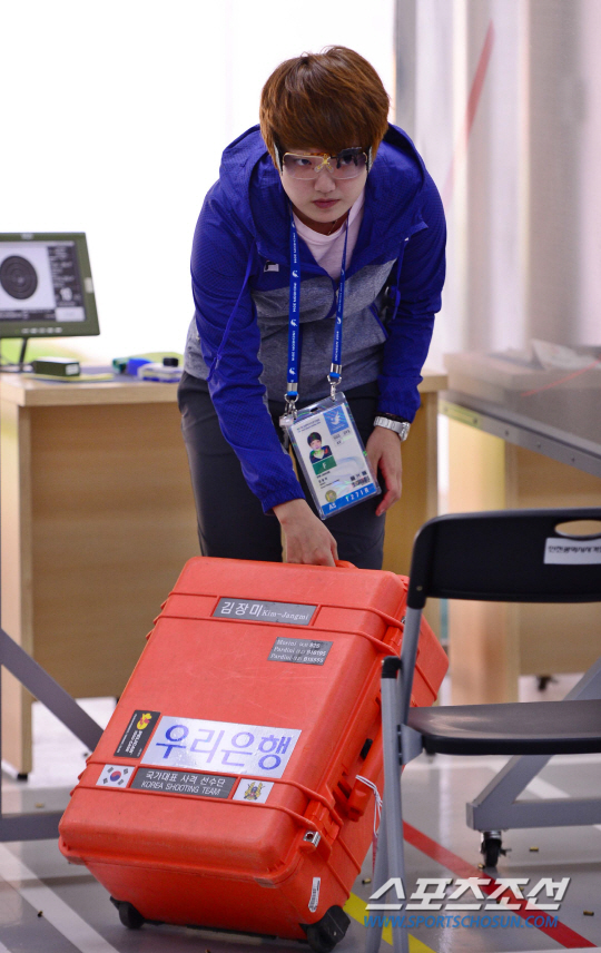 22일 오전 인천 옥련국제사격장에서 2014 인천 아시안게임 여자 25M 권총 개인 및 단체 예선전이 열렸다. 예선 1라운드를 끝낸 한국 김장미가 짐을 챙기고 있다.