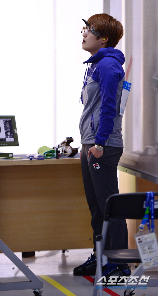 22일 오전 인천 옥련국제사격장에서 2014 인천 아시안게임 여자 25M 권총 개인 및 단체 예선전이 열렸다. 한국 김장미가 게임이 마음대로 안 풀리자 아쉬운 표정을 짓고 있다.