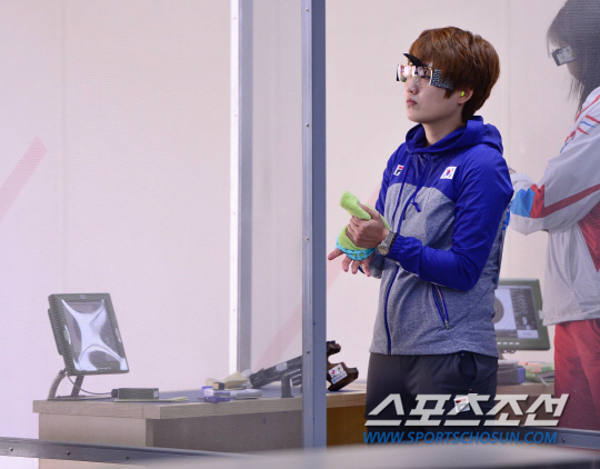 22일 오전 인천 옥련국제사격장에서 2014 인천 아시안게임 여자 25M 권총 개인 및 단체 예선전이 열렸다. 한국 김장미가 손의 땀을 닦고 있다.