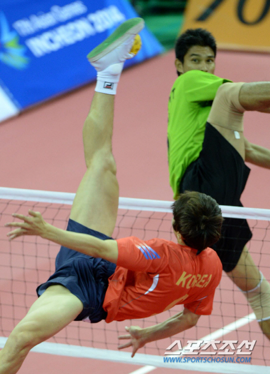 2014 인천아시안게임 남자 세팍타크로 더블 결승, 한국과 미얀마의 경기가 22일 부천체육관에서 열렸다. 임안수가 공격을 시도하고 있다. 남자 더블대표팀은 김영만, 정원덕, 임안수로 구성되어 있다.