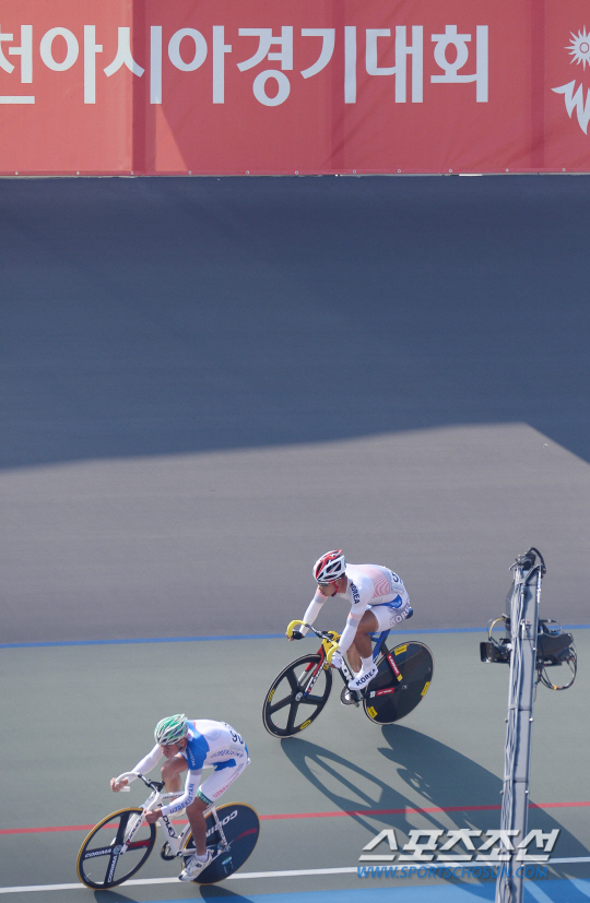 한국남자사이클 조호성이 22일 인천국제벨로드롬에서 열린 2014 인천아시안게임 남자 옴니옴 스크래치 15km 레이스에서 역주하고 있다.