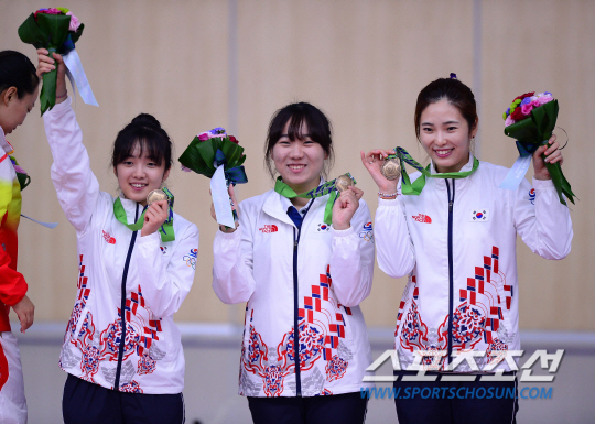 22일 오전 인천 옥련국제사격장에서 2014 인천 아시안게임 여자 사격 10M 공기소총 결승전이 열렸다. 사격 10M 공기소총 단체전에서 동메달을 획득한 한국 김설아(왼쪽부터), 김계남, 정미라가 환하게 웃고 있다.