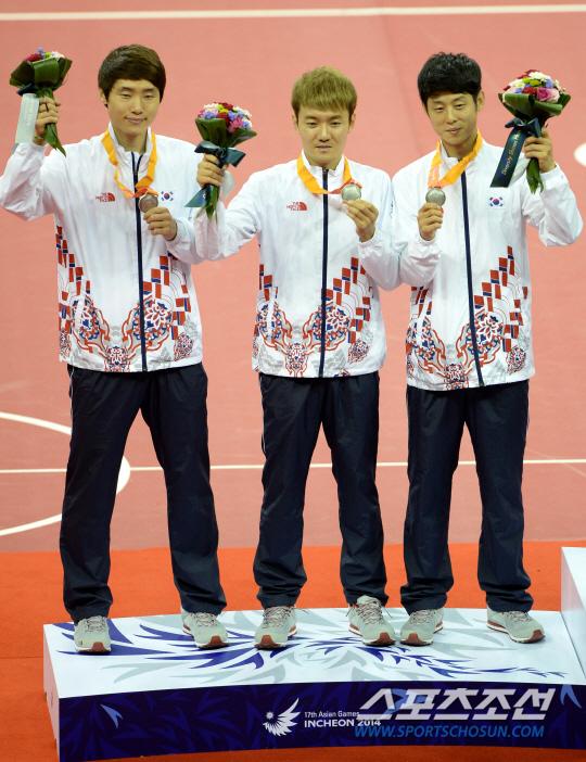 2014 인천아시안게임 남자 세팍타크로 더블 결승, 한국과 미얀마의 경기가 22일 부천체육관에서 열렸다. 세트스코어 2-0으로 아쉽게 패하며 은메달 획득에 성공했다. 이어 진행된 시상식에서 임안수, 정원덕, 김영만이 메달과 함께 포즈를 취하고 있다.