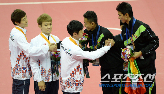 2014 인천아시안게임 남자 세팍타크로 더블 결승, 한국과 미얀마의 경기가 22일 부천체육관에서 열렸다. 세트스코어 2-0으로 아쉽게 패하며 은메달 획득에 성공했다. 이어 진행된 시상식에서 임안수, 정원덕, 김영만이 금메달을 획득한 미얀마 선수들과 악수를 나누고 있다.