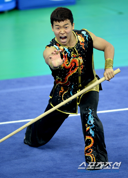 인천 아시안게임 우슈 남자 남곤 결승전이 22일 경기도 강화읍 강화고인돌체육관에서 열렸다. 6위를 차지한 한국 이용문이 연기를 펼치고 있다.
