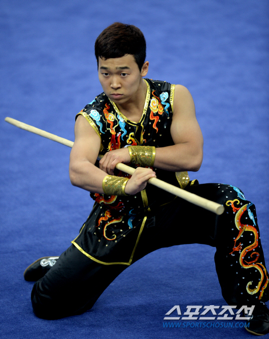 인천 아시안게임 우슈 남자 남곤 결승전이 22일 경기도 강화읍 강화고인돌체육관에서 열렸다. 6위를 차지한 한국 이용문이 연기를 펼치고 있다.
