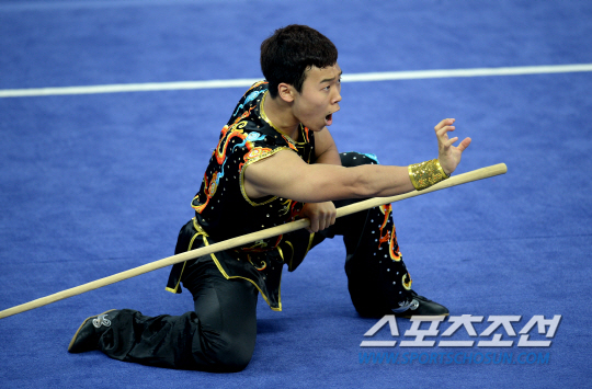 인천 아시안게임 우슈 남자 남곤 결승전이 22일 경기도 강화읍 강화고인돌체육관에서 열렸다. 6위를 차지한 한국 이용문이 연기를 펼치고 있다.