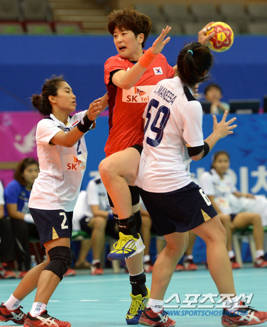 2014 인천아시안게임 여자핸드볼 예선 2차전 한국과 태국의 경기가 22일 수원실내체육관에서 열렸다. 류은희가 공격을 시도하고 있다.