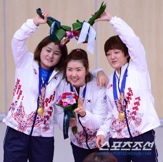 22일 오후 인천 옥련국제사격장에서 열린 2014 인천 아시안게임 사격 여자 25M 권총 단체전 시상식에서 금메달을 딴 김장미(오른쪽부터), 곽정혜,이정은가 환하게 웃고 있다.
