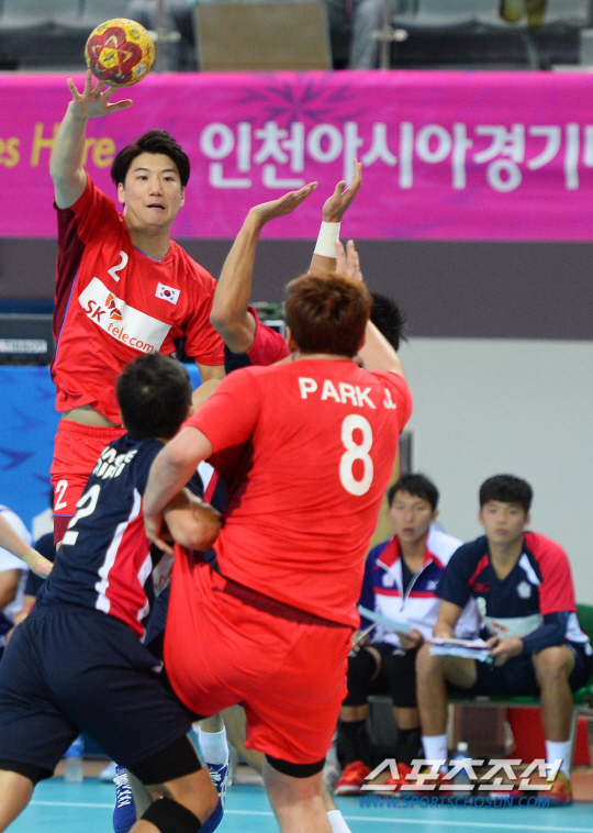 한국남자핸드볼 대표팀 정이경이 22일 인천선학핸드볼경기장에서 열린 남자핸드볼 예선전 대만과의 경기에서 박준규에게 패스를 하고있다.
