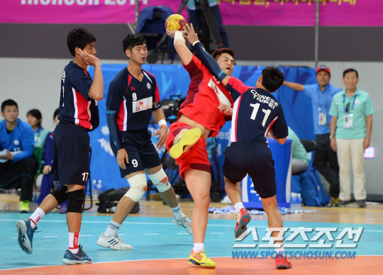 한국남자핸드볼 대표팀 엄효원이 22일 인천선학핸드볼경기장에서 열린 남자핸드볼 예선전 대만과의 경기에서 대만 왕싱의 수비사이로 슛팅을 하고있다.