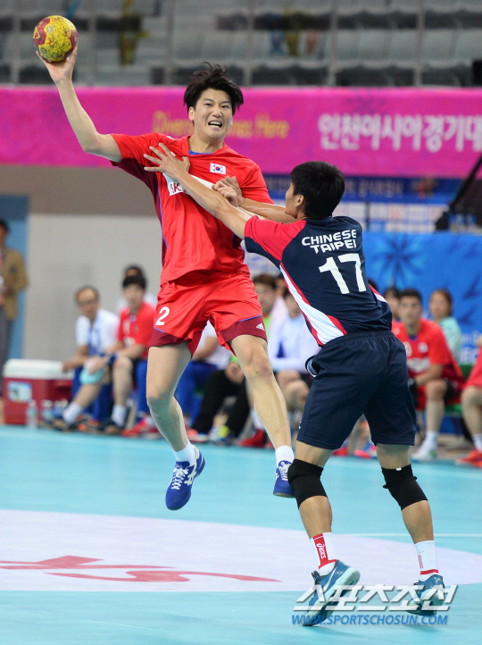 한국남자핸드볼 대표팀 정이경이 22일 인천선학핸드볼경기장에서 열린 남자핸드볼 예선전 대만과의 경기에서 박준규에게 패스를 하고있다.