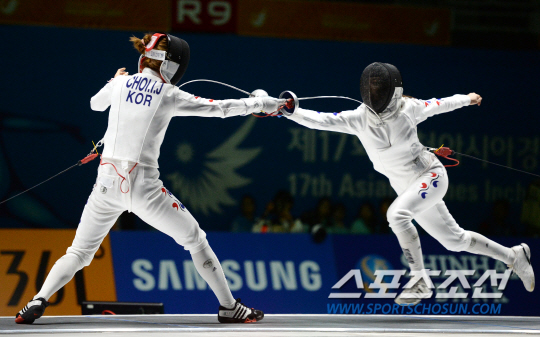신아람과 최인정이 인천 아시안게임 펜싱 여자 에뻬 개인전 준결승 경기가 22일 경기도 고양실내체육관에서 열렸다. 최인정(왼쪽)과 신아람이 양보없는 대결을 펼치고 있다.