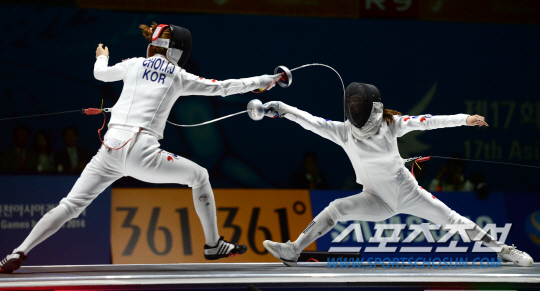신아람과 최인정이 인천 아시안게임 펜싱 여자 에뻬 개인전 준결승 경기가 22일 경기도 고양실내체육관에서 열렸다. 최인정(왼쪽)과 신아람이 동시에 공격을 성공시키고 있다.