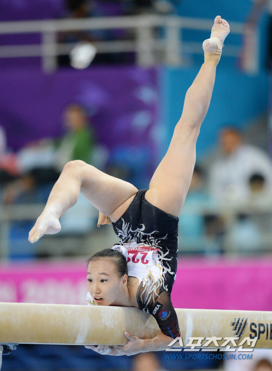 한국여자체조 대표 박지수가 22일 인천남동체육관에서 열린 2014인천아시안게임 여자기계체조 단체 결승전 평균대종목에서 회전을 선보이고 있다.