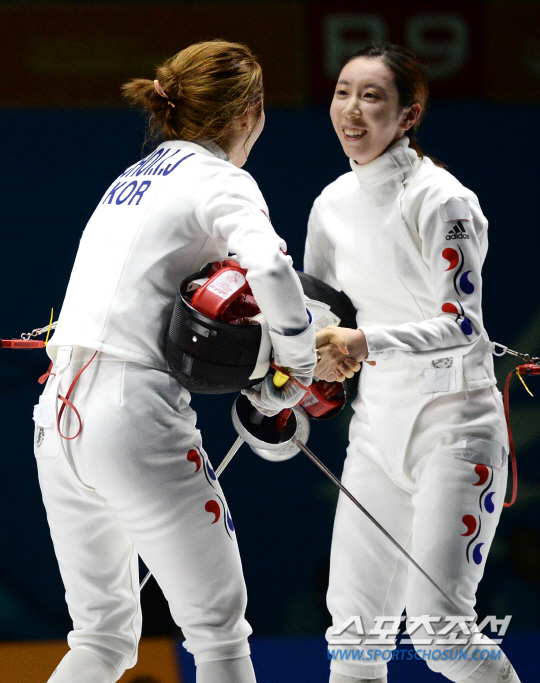 신아람과 최인정이 인천 아시안게임 펜싱 여자 에뻬 개인전 준결승 경기가 22일 경기도 고양실내체육관에서 열렸다. 신아람이 최인정을 꺾고 결승에 진출한 가운데 두 선수가 경기 후 악수를 나누고 있다.