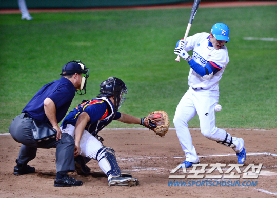 21일 오후 인천 문학구장에서 2014 인천 아시안게임 야구 한국과 태국의 경기가 열렸다. 1회말 2사 만루서 한국 민병헌이 볼을 맞고 있다.