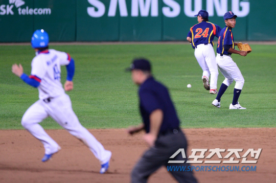 21일 오후 인천 문학구장에서 2014 인천 아시안게임 야구 한국과 태국의 경기가 열렸다. 1회말 2사 만루서 태국 수비수가 손아섭의 플라이를 놓치고 있다.