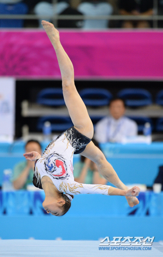 한국여자체조 대표 윤나래가 22일 인천남동체육관에서 열린 2014인천아시안게임 여자기계체조 단체 결승전 마루종목에서 공중회전을 선보이고 있다.