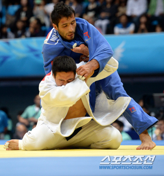 2014 인천아시안게임 남자 유도 -90Kg 동메달 결정전 곽동한과 타지키스탄의 우스토피리온의 경기가 22일 인천 도원체육관에서 열렸다. 곽동한이 연장 우세승으로 동메달을 획득했다. 곽동한이 우스토피리온과 접전을 벌이고 있는 모습.