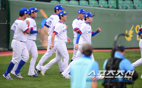 21일 오후 인천 문학구장에서 2014 인천 아시안게임 야구 한국과 태국의 경기가 열렸다. 경기 전 한국 대표팀 선수들이 선수 소개 때 그라운드에 나서고 있다.