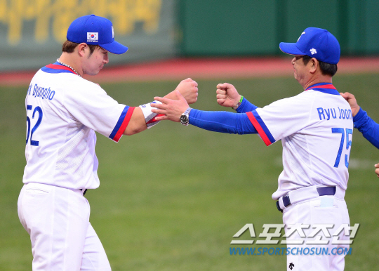 21일 오후 인천 문학구장에서 2014 인천 아시안게임 야구 한국과 태국의 경기가 열렸다. 경기 전 한국 류중일 감독이 박병호와 주먹을 맞추고 있다.