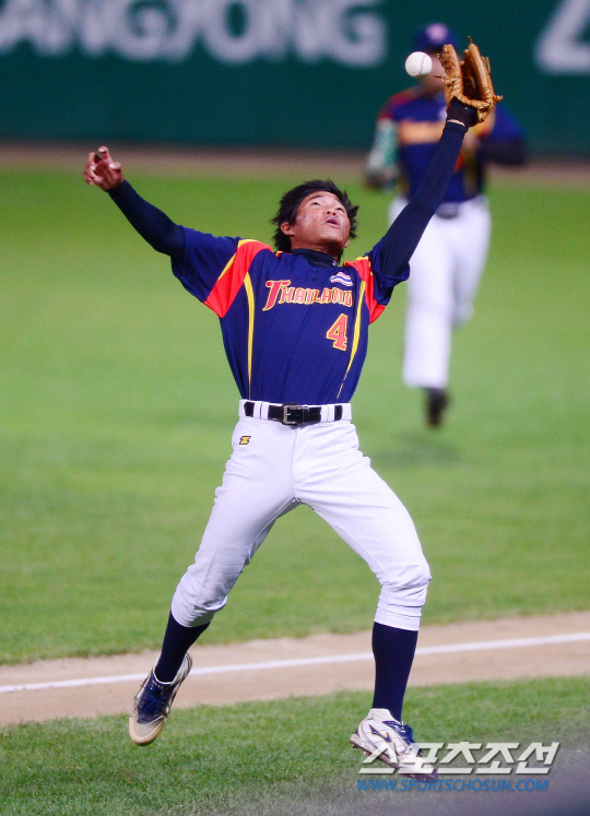 21일 오후 인천 문학구장에서 2014 인천 아시안게임 야구 한국과 태국의 경기가 열렸다. 2회말 2사 1,2루서 태국 1루수가 민병헌의 파울 타구를 놓치고 있다.